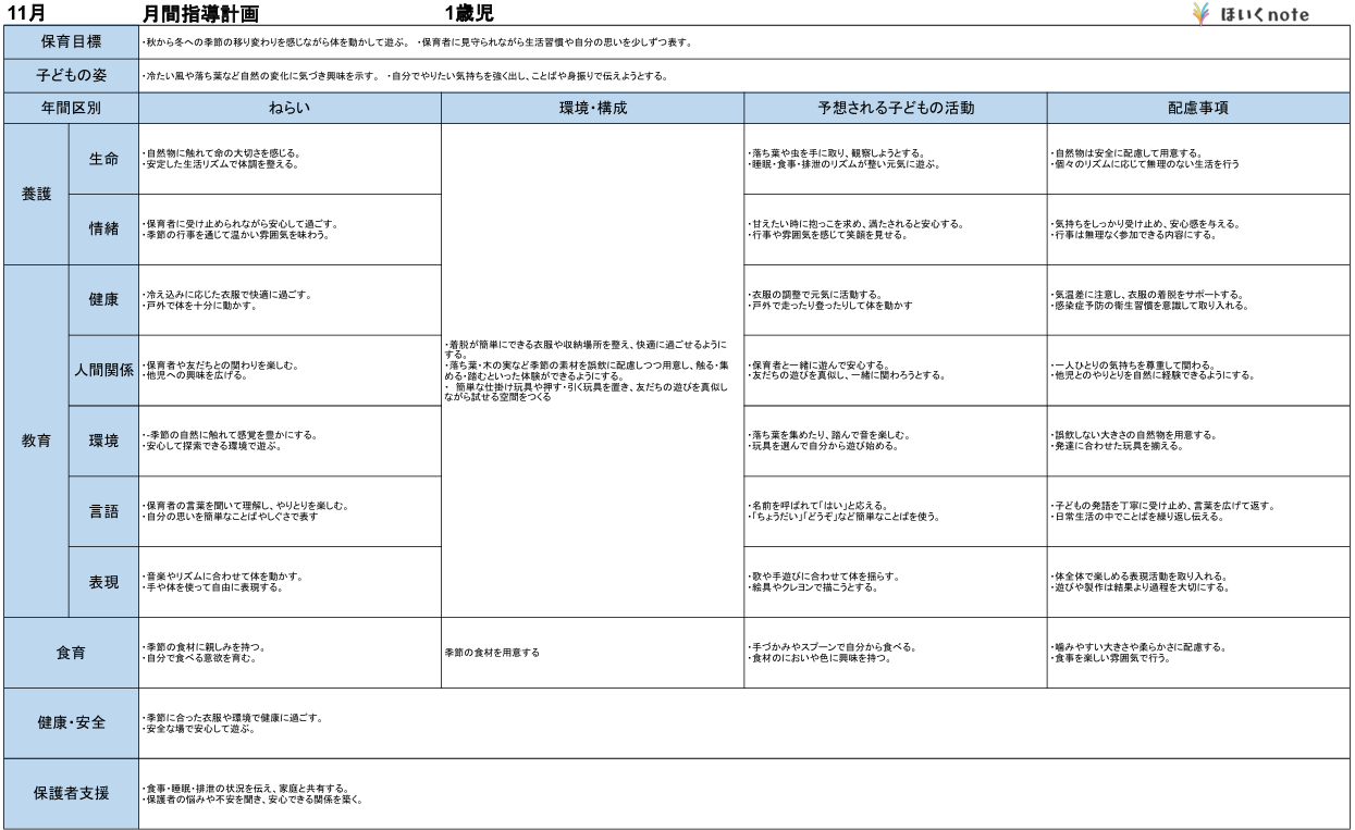 2025年度版、【11月の指導計画(月案)】<1歳児クラス>です。