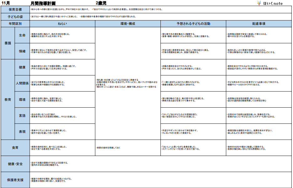 【2025年度11月の指導計画(月案)】文例とフォーマット<2歳児クラス>