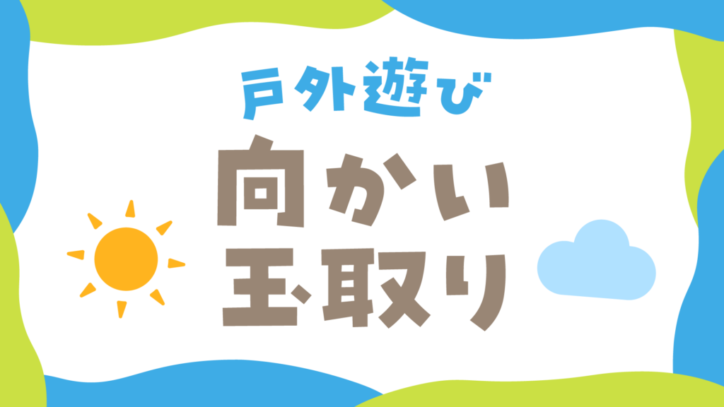 玉入れの導入や外遊びの設定保育などで手軽にできる遊び、【向かい玉取り】について、あらたうがこさんのイラストを使ってお伝えしていきます!