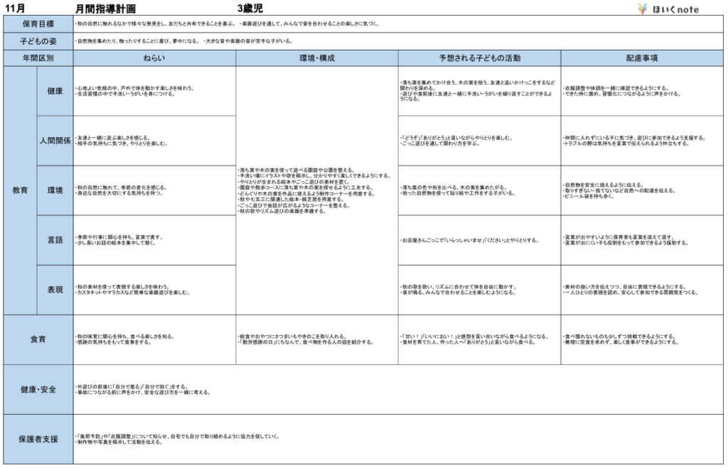 2022年度版、【11月の指導計画(月案)】<3歳児クラス>となります。 前月の子どもの姿、保育目標、「ねらい」「環境・構成」「予想される子どもの活動」「配慮事項」を記載。食育、健康安全、家庭や地域との連携など、さまざまな例を見ながら、自分なりの計画が作れる参考文例・フォーマットをご紹介!