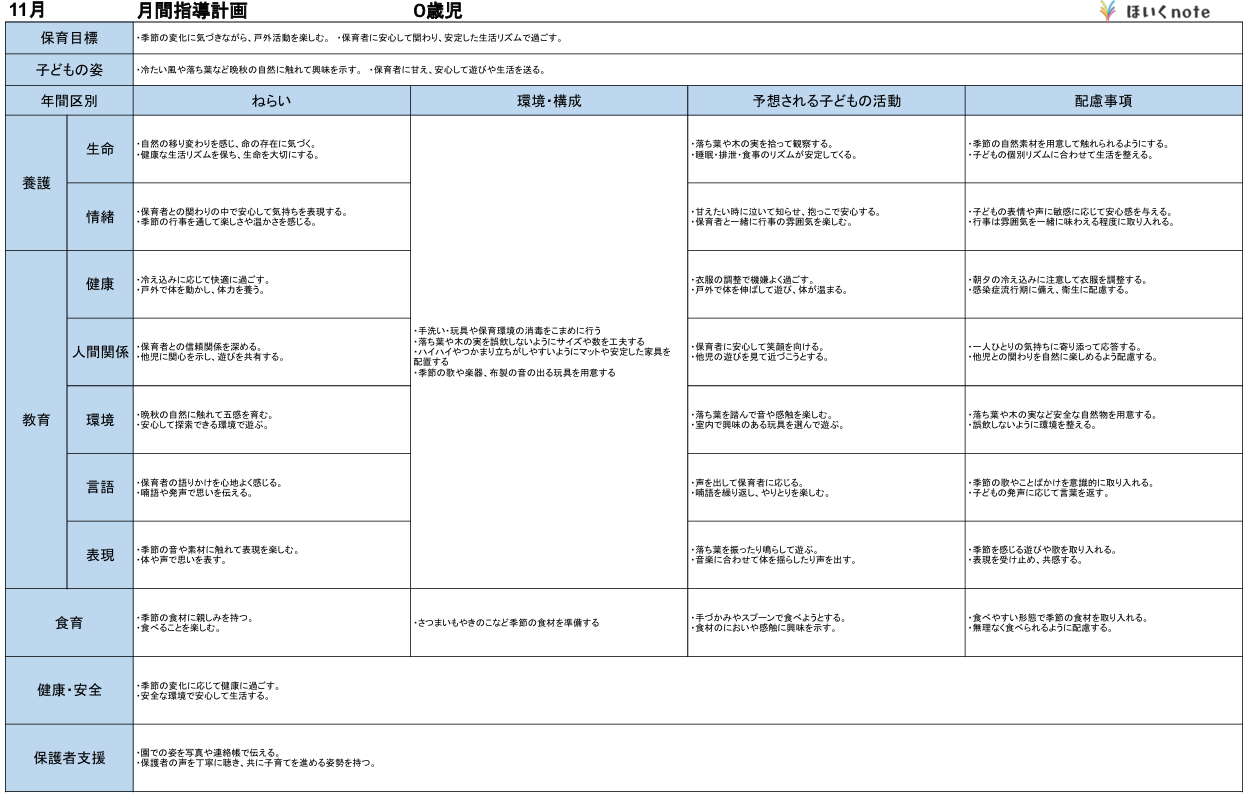 2025年度版、【11月の指導計画(月案)】<0歳児クラス>です。