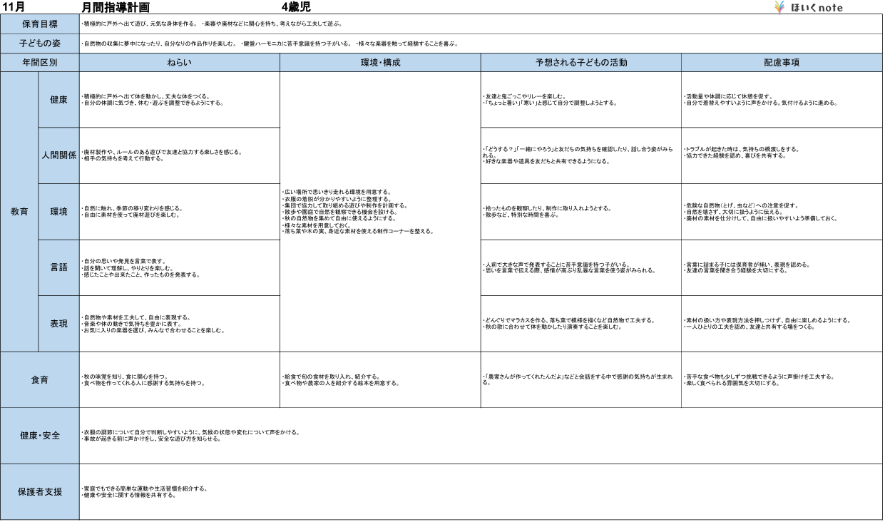 2025年度版、【11月の指導計画(月案)】<4歳児クラス>です。