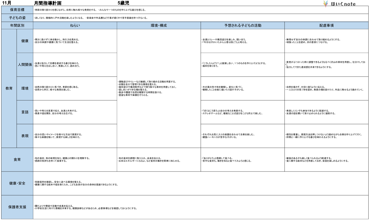 2025年度版、【11月の指導計画(月案)】<5歳児クラス>です。