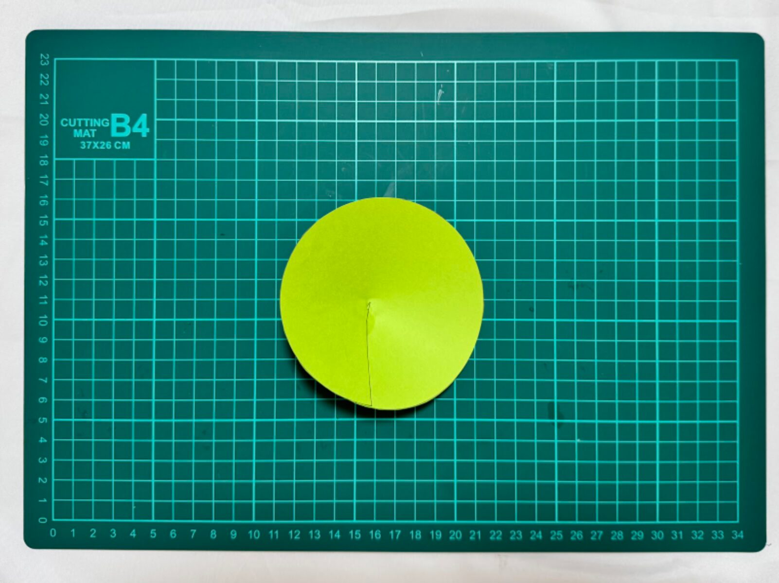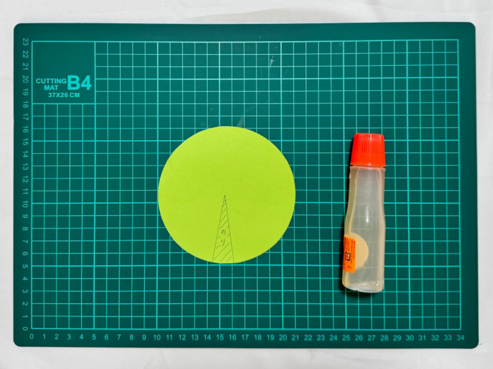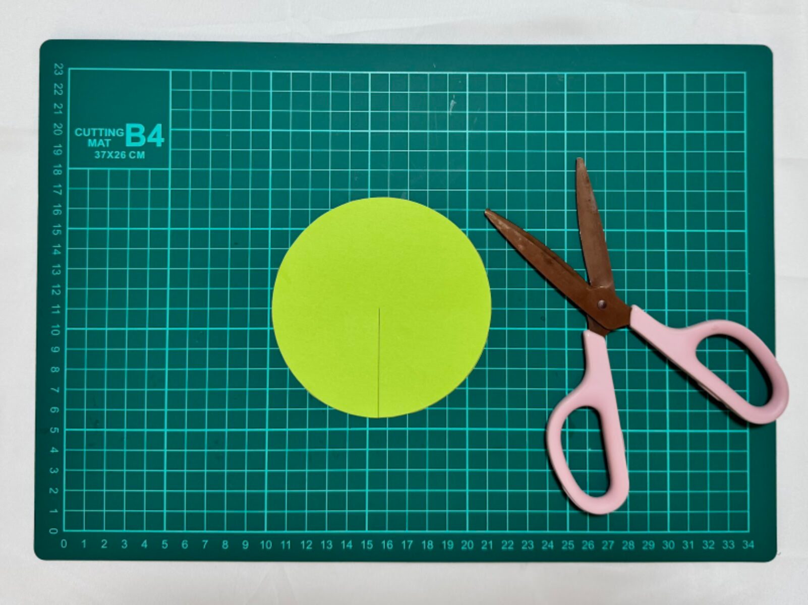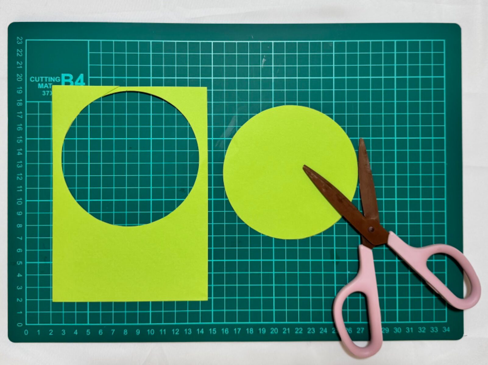 甲羅用の画用紙を、円形に切ります。お皿などで形を取って描くと綺麗に出来ます。