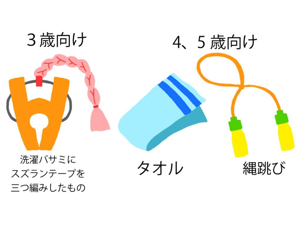 - ・3歳児は洗濯バサミにすずらんテープを括り付けるなど、簡単に付け外しができる物を準備すると良いです。4.5歳になると尻尾を縄跳びやタオルで代用できる事に気づけるよう促しましょう。