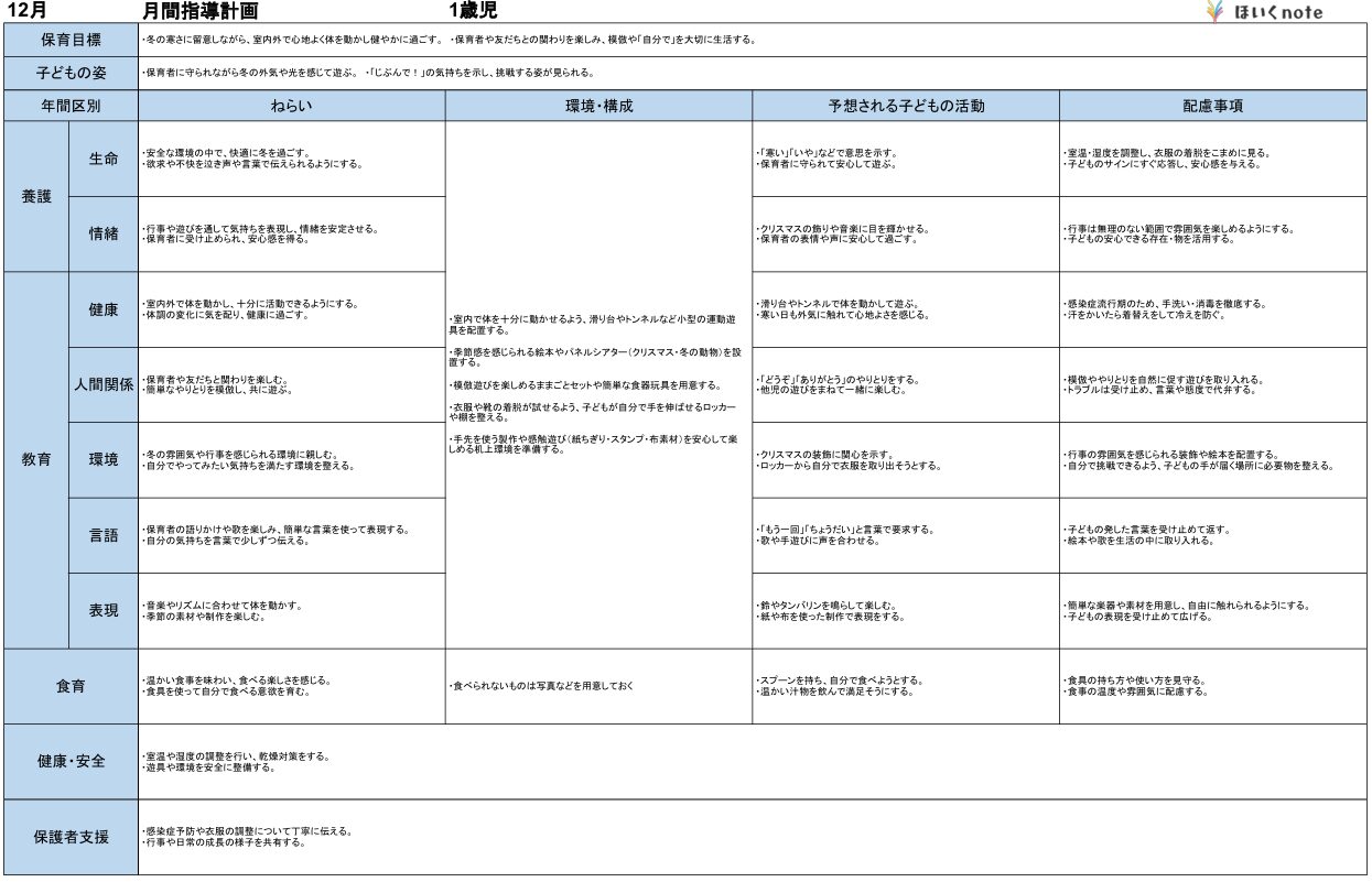 2025年度版、【12月の指導計画(月案)】<1歳児クラス>です。