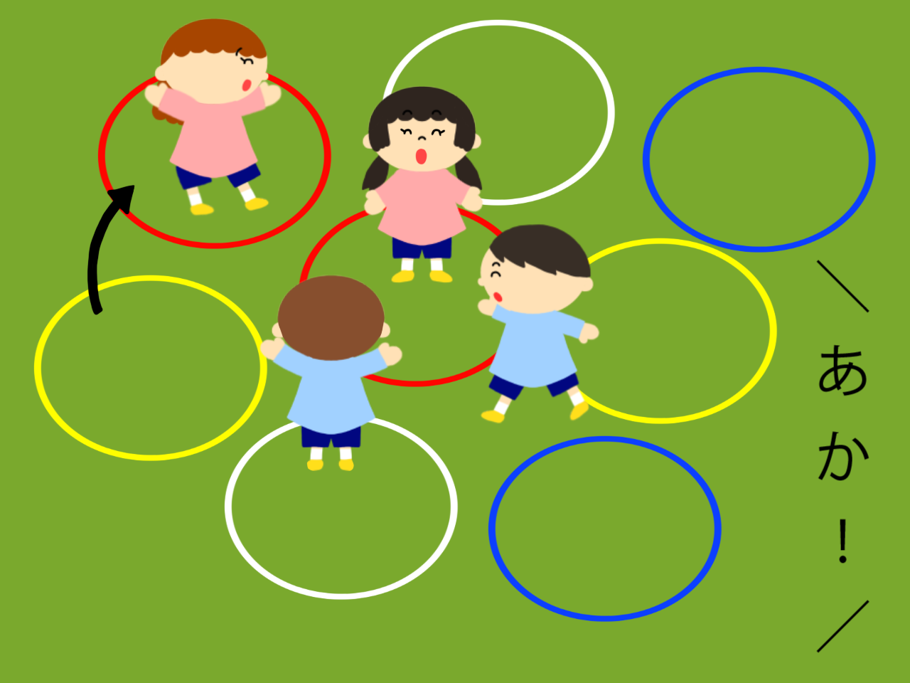 お引っ越し設定にします。「次は赤のお家にお引っ越し〜」「青の幼稚園にお引っ越し〜」など、設定があるだけで子どもたちはイメージしやすく、喜んで参加します。