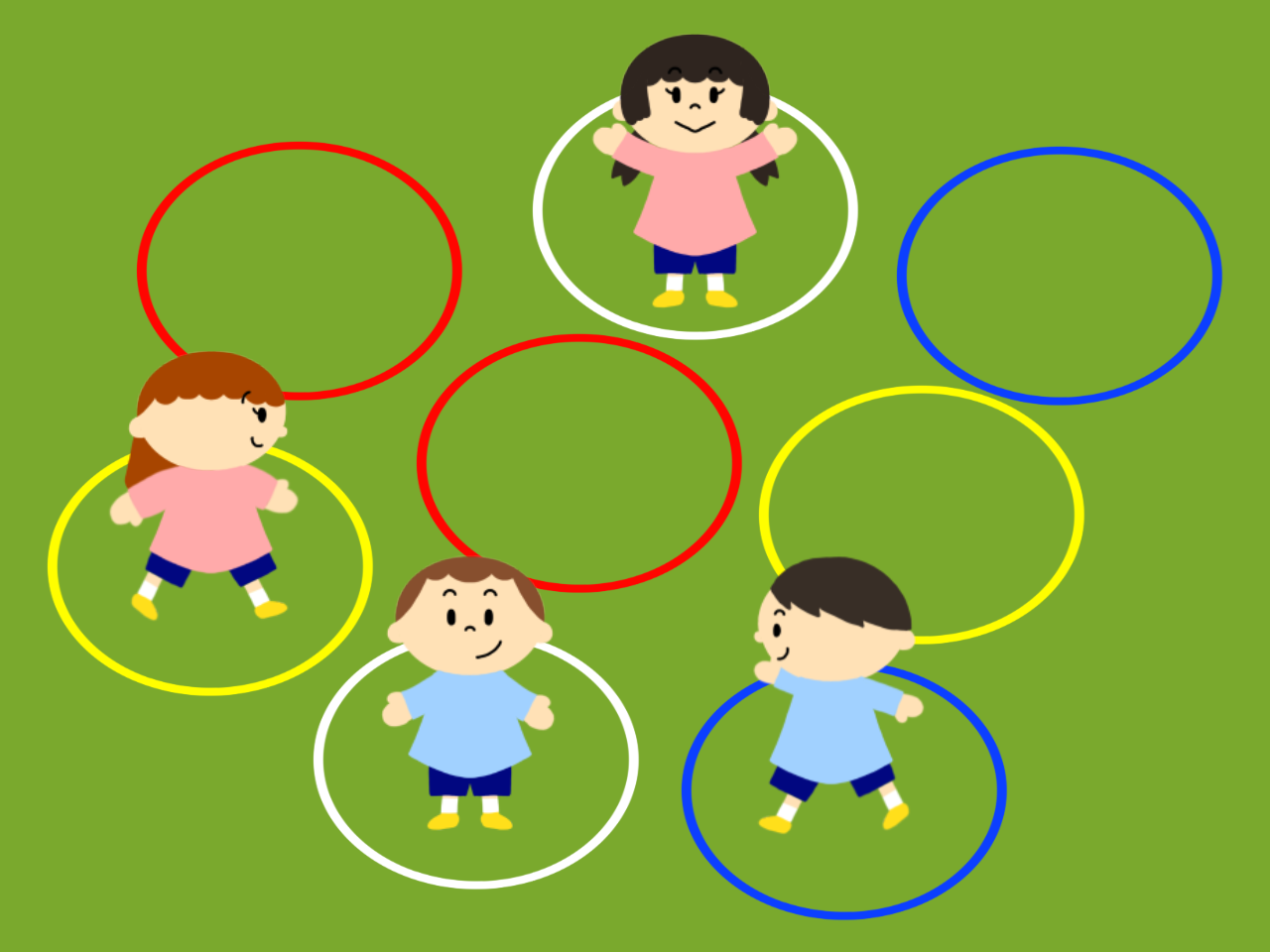 フープに入る人数を指定します。「2人で緑!」「3人で赤!」など。「1人で青」にすると、入れない子も出てきます。簡単な罰ゲームをしても良いでしょう。(こしょばすなど)