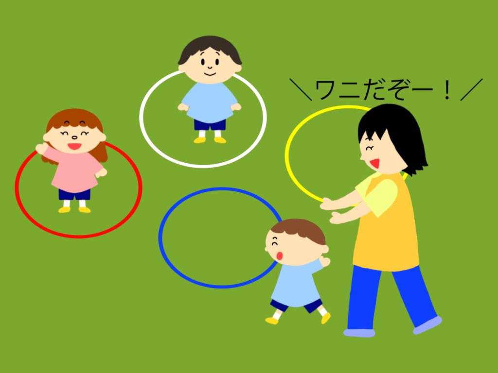 先生がワニに変身してフープ内へ逃げる設定にしたり、お家に見立ててお引っ越しする設定にしても楽しいですよ♪