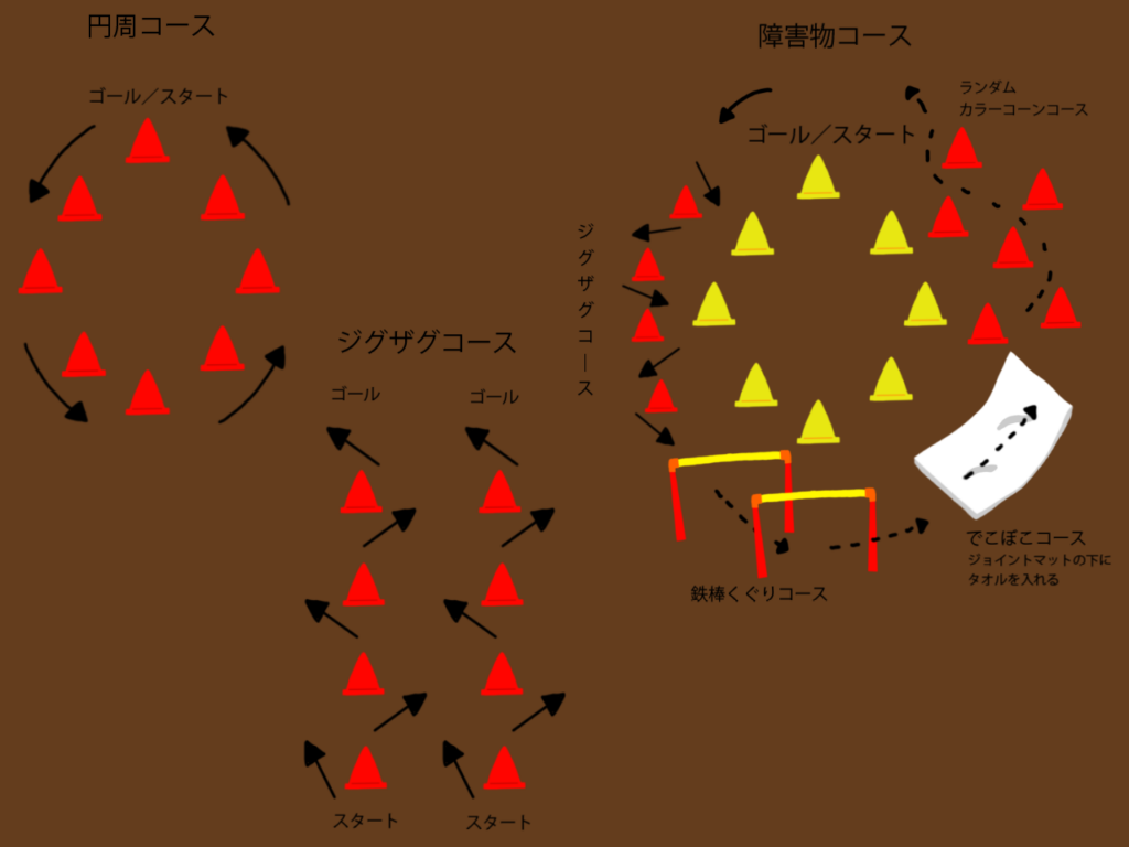 - 子ども同士がぶつからないように順番待ちをしている子の列と、カラーコーンのコースの間に十分なスペースを確保する