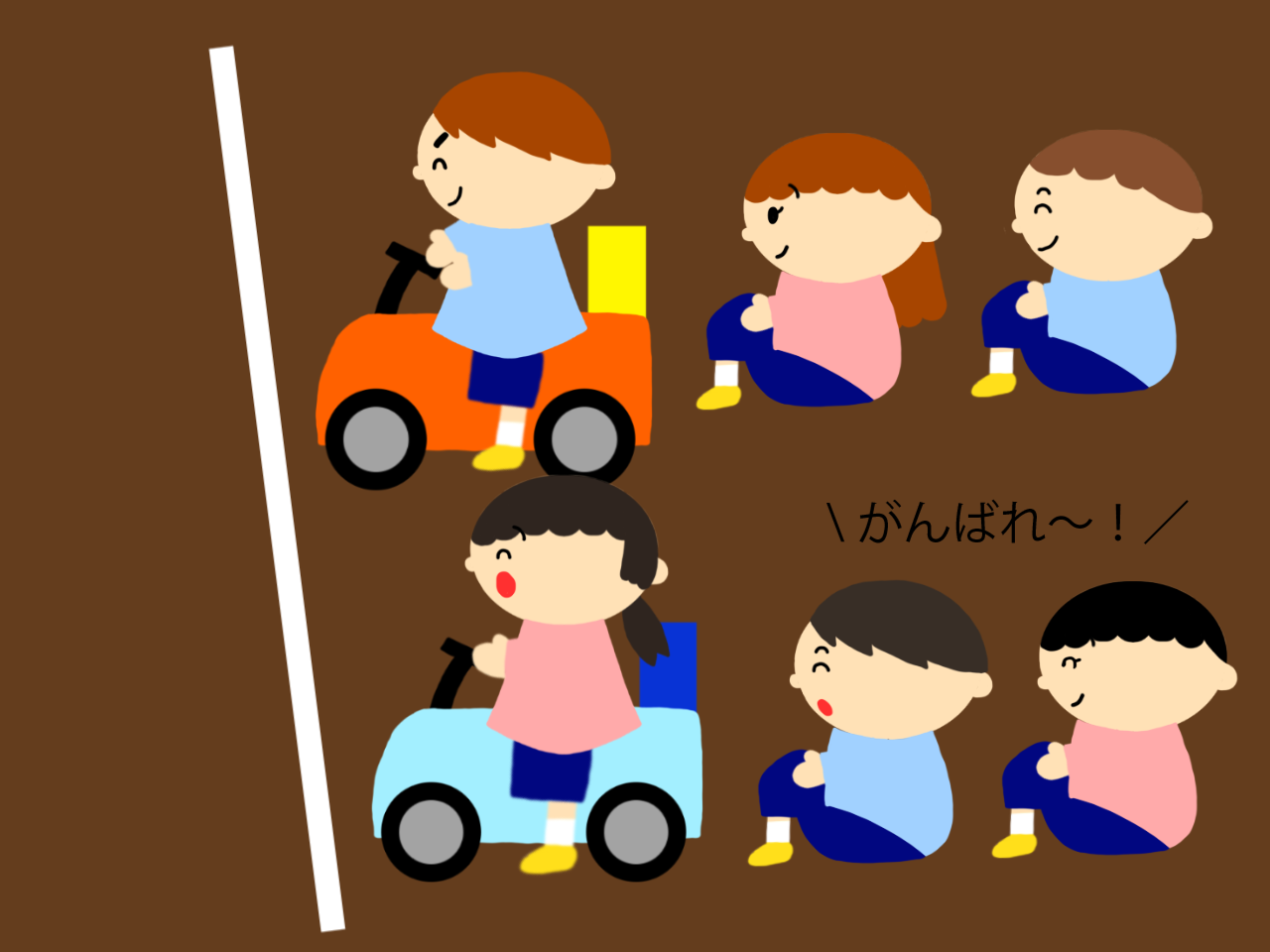 - 競争心を養うための声かけとして、待っている子と応援をしたり、「勝ったのは、○○君でした!」と勝敗を発表しても盛り上がりますよ♪