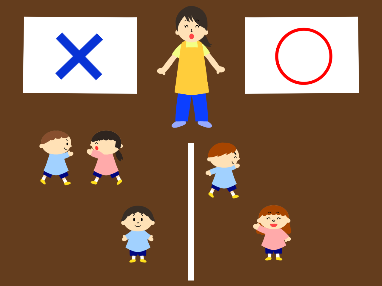 子どもたちはマルかバツのどちらかを考えて、正解だと思った方のエリアに移動します。