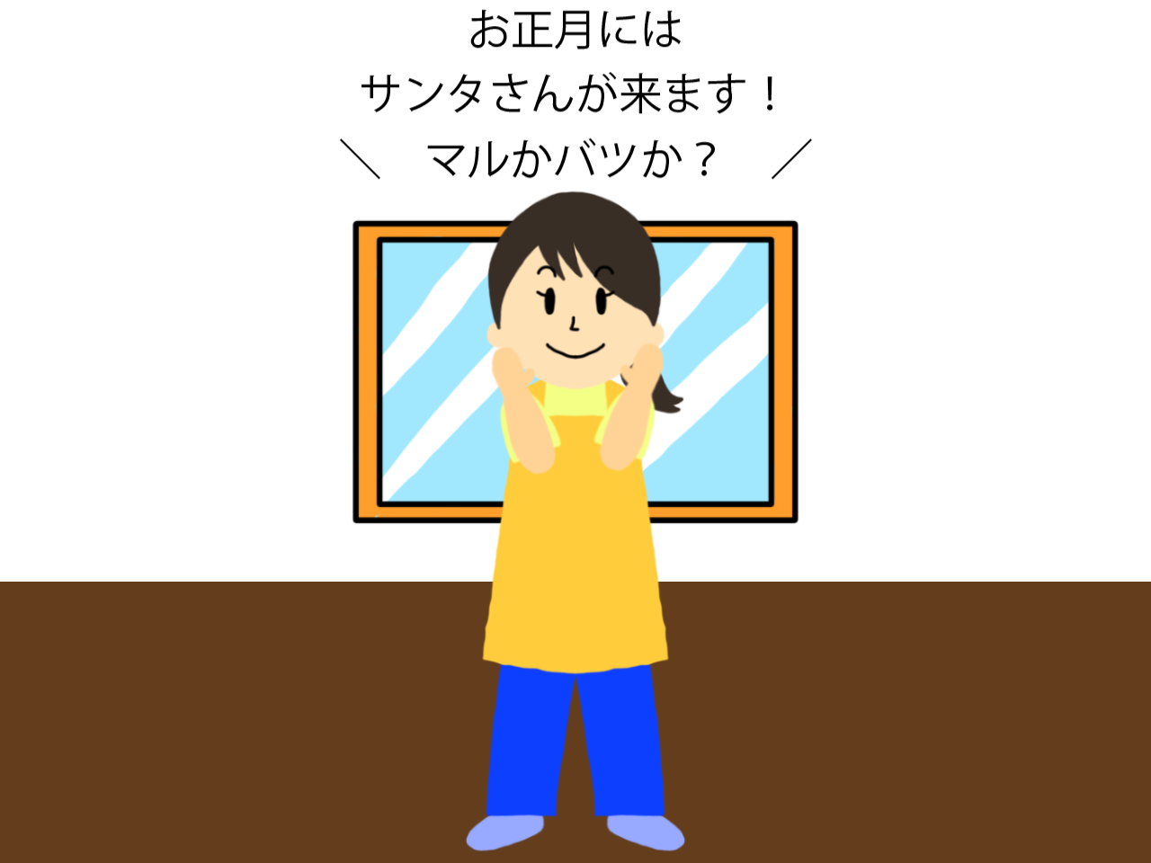 保育者が出題します。 例:お正月には、サンタさんが来ます。マルか、バツかどちらでしょう?