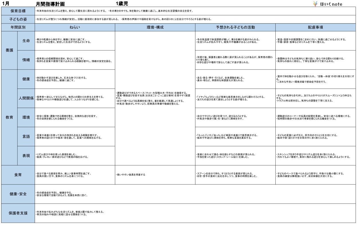 2026年度版、【01月の指導計画(月案)】<1歳児クラス>です。