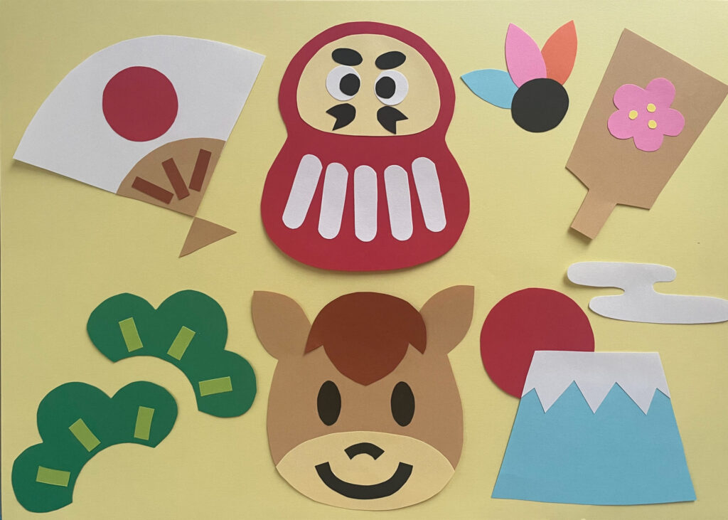 2026年の干支であるおうまさん、おめでたいだるまや富士山、背景にはお正月を感じられる羽子板や扇子を配置した1月にぴったりの楽しい壁面用イラストを無料配布中。
