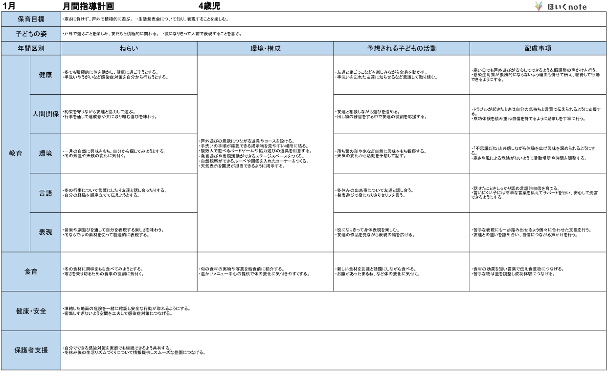 2026年度版、【01月の指導計画(月案)】<4歳児クラス>です。