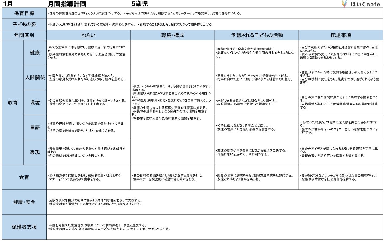 2026年度版、【01月の指導計画(月案)】<5歳児クラス>です。