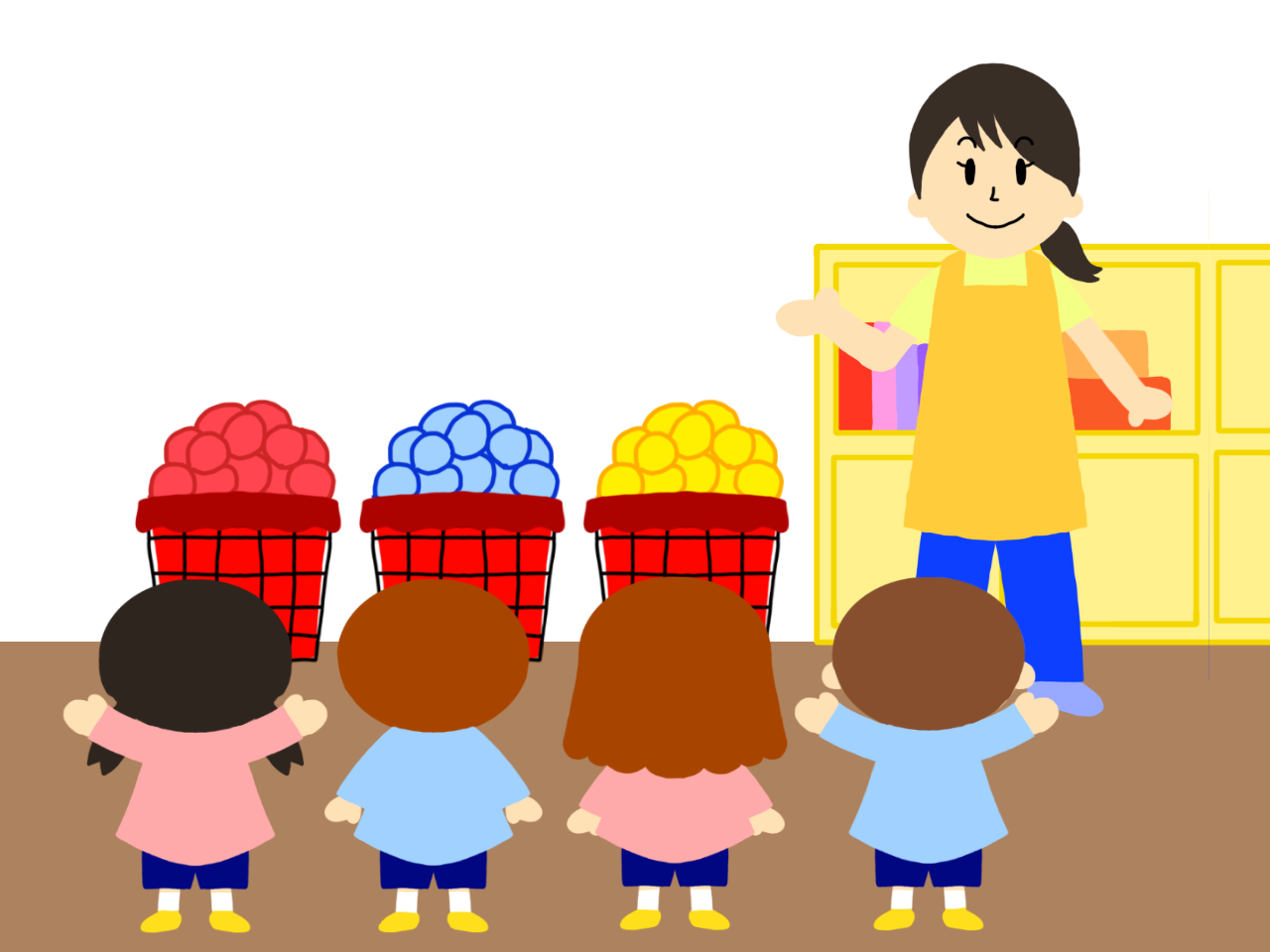 カラーボールを色ごとに分けて入れたカゴを子どもたちに見せ、色の違いを確認します