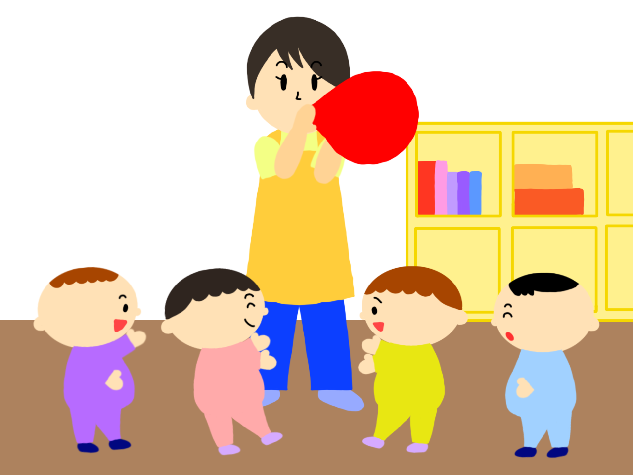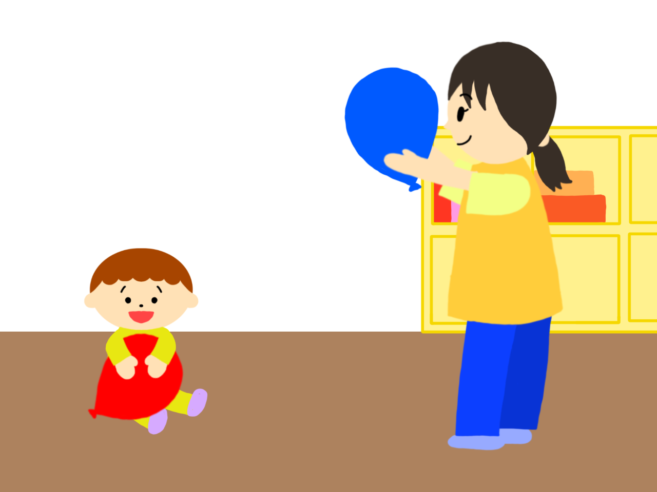 - 保育者は子どもが風船の動きを楽しめるように、ポンポンと優しく風船を跳ねさせて子どもの興味を誘ってください