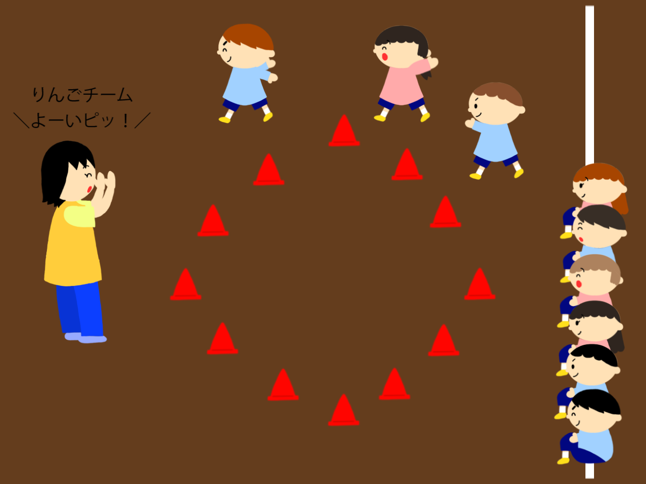 3. 保育士の「○○チーム!よーい!ピーッ(笛)」の合図で、呼ばれたチームの子だけがカラーコーンの周りを一周走ります。