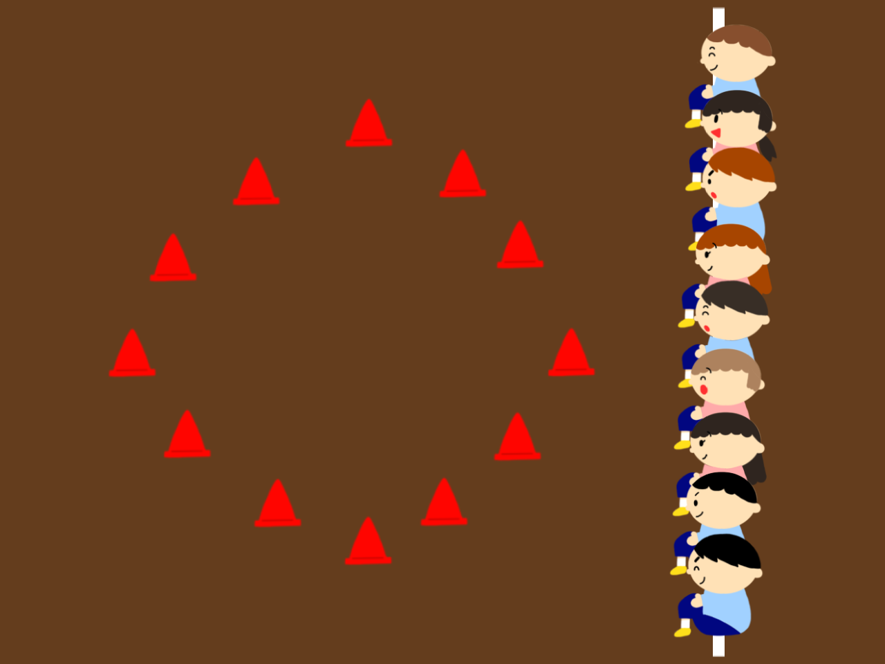 • 遊戯室や体育館などの広い場所で、カラーコーンを円になるように並べておきます