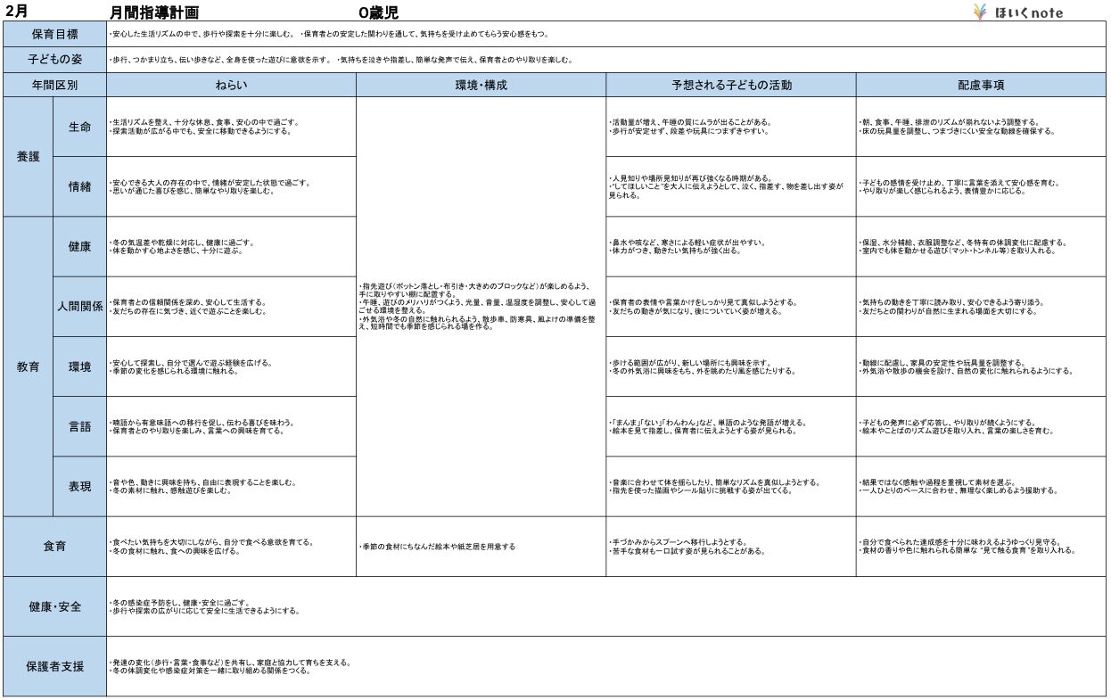 2026年度版、【02月の指導計画(月案)】<0歳児クラス>です。