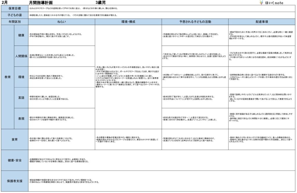 2026年度版、【02月の指導計画(月案)】<3歳児クラス>となります。 前月の子どもの姿、保育目標、「ねらい」「環境・構成」「予想される子どもの活動」「配慮事項」を記載。食育、健康安全、家庭や地域との連携など、さまざまな例を見ながら、自分なりの計画が作れる参考文例・フォーマットをご紹介!