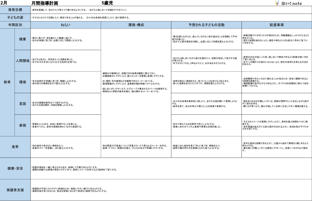2026年度版、【02月の指導計画(月案)】<5歳児クラス>です。