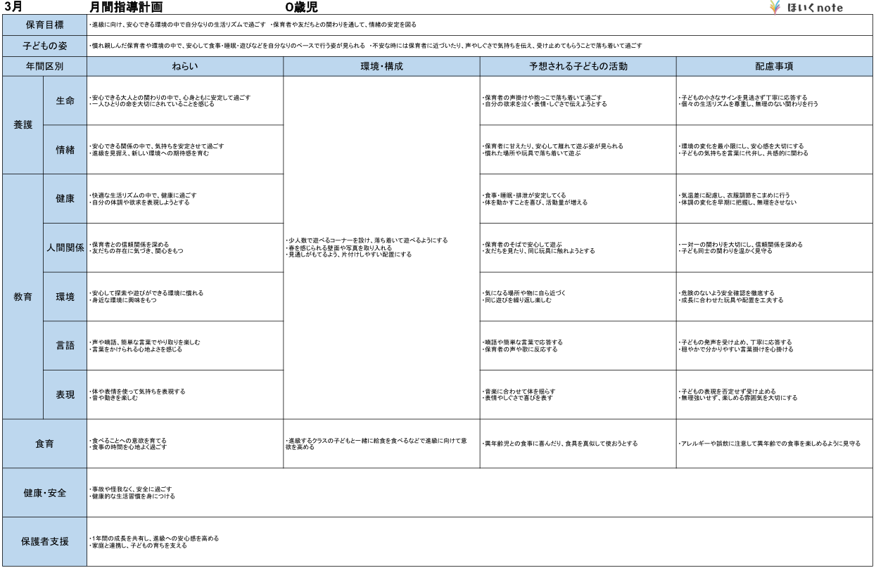 2026年度版、【03月の指導計画(月案)】<0歳児クラス>です。