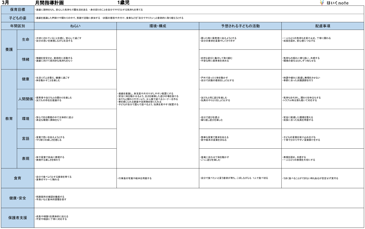 2026年度版、【03月の指導計画(月案)】<1歳児クラス>です。