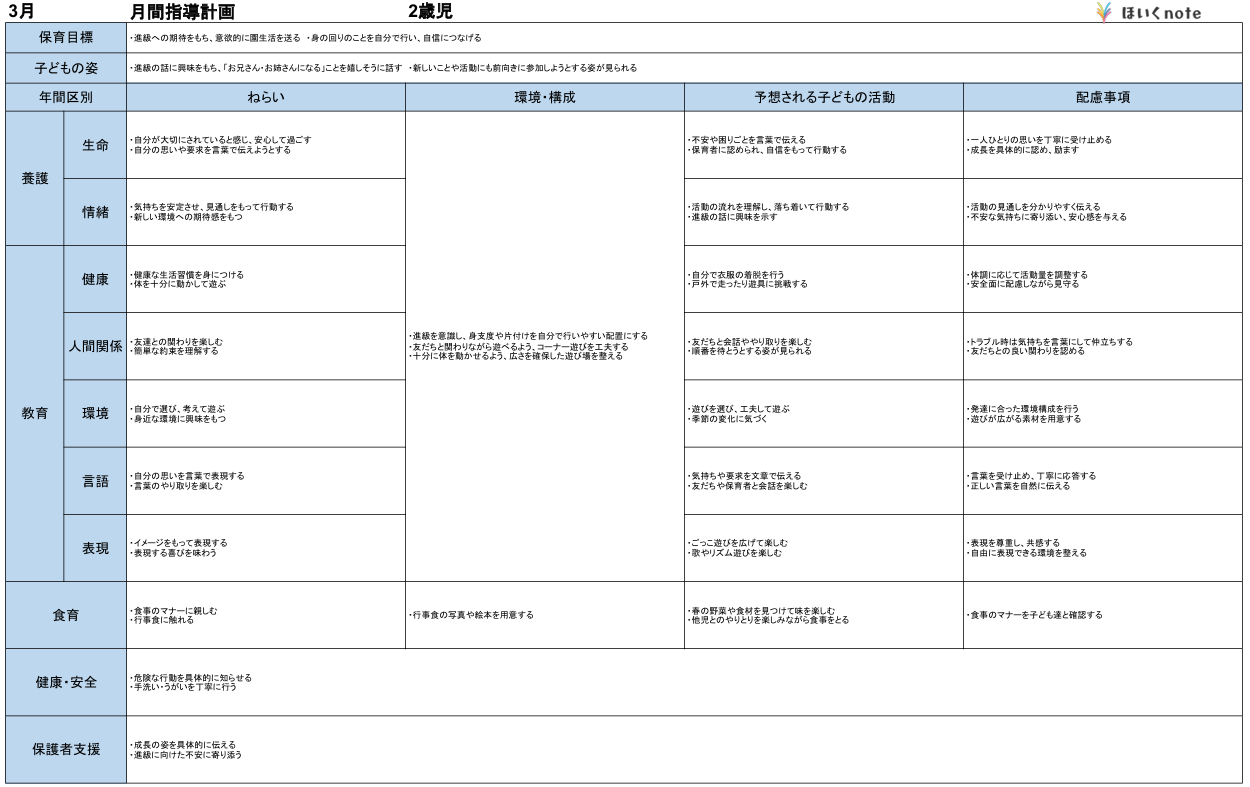 2026年度版、【03月の指導計画(月案)】<2歳児クラス>です。