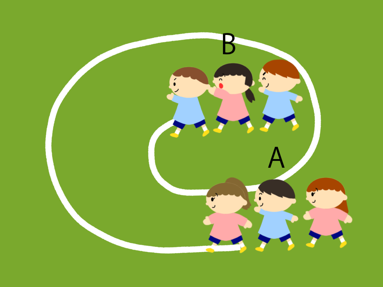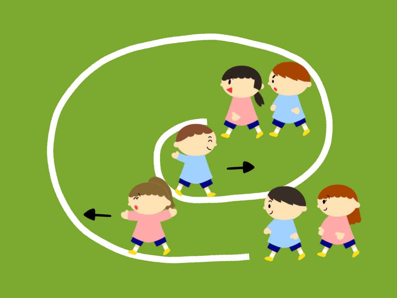 全体を2チームに分け、ぐるぐるの中心と外側にそれぞれ1列に並びます。