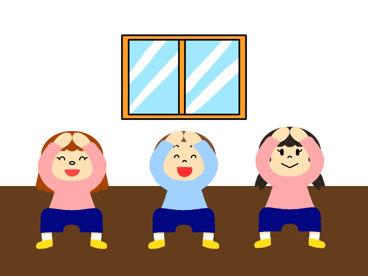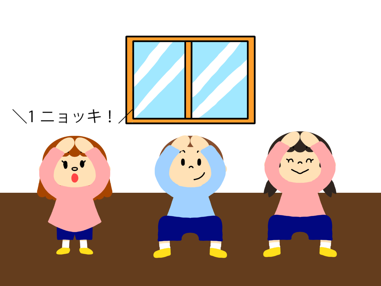 頭の上に手でたけのこを作り、全員で「たけのこたけのこニョッキッキ!」と言ってしゃがみます。