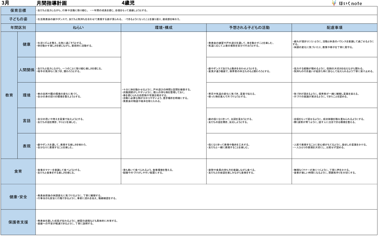 2026年度版、【03月の指導計画(月案)】<4歳児クラス>です。