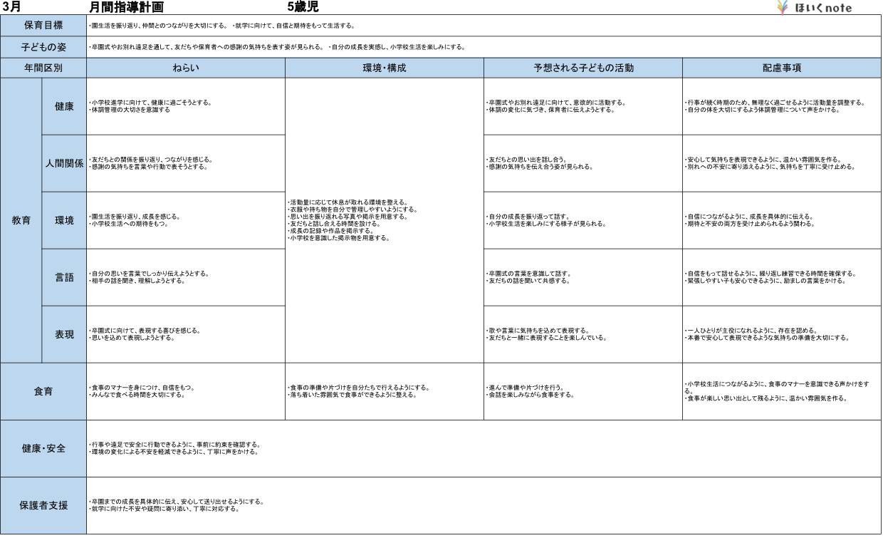 2026年度版、【03月の指導計画(月案)】<5歳児クラス>です。