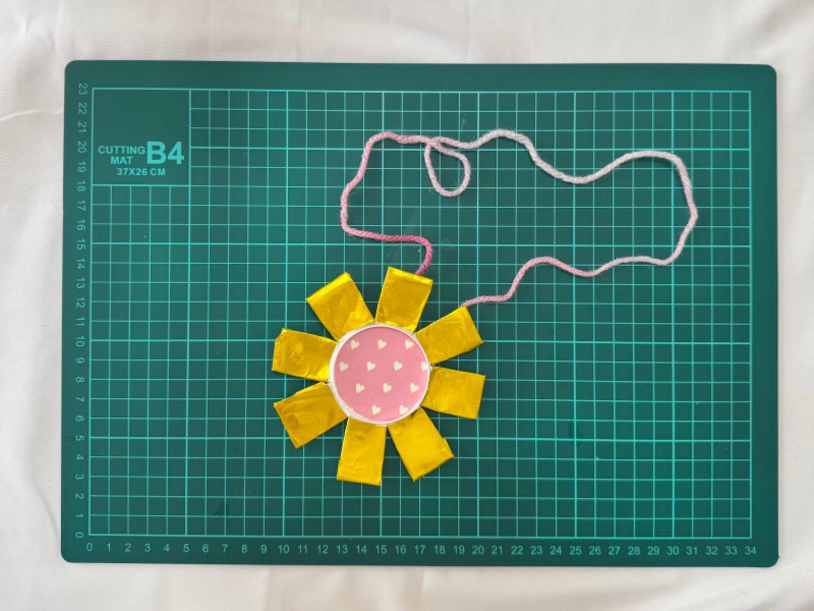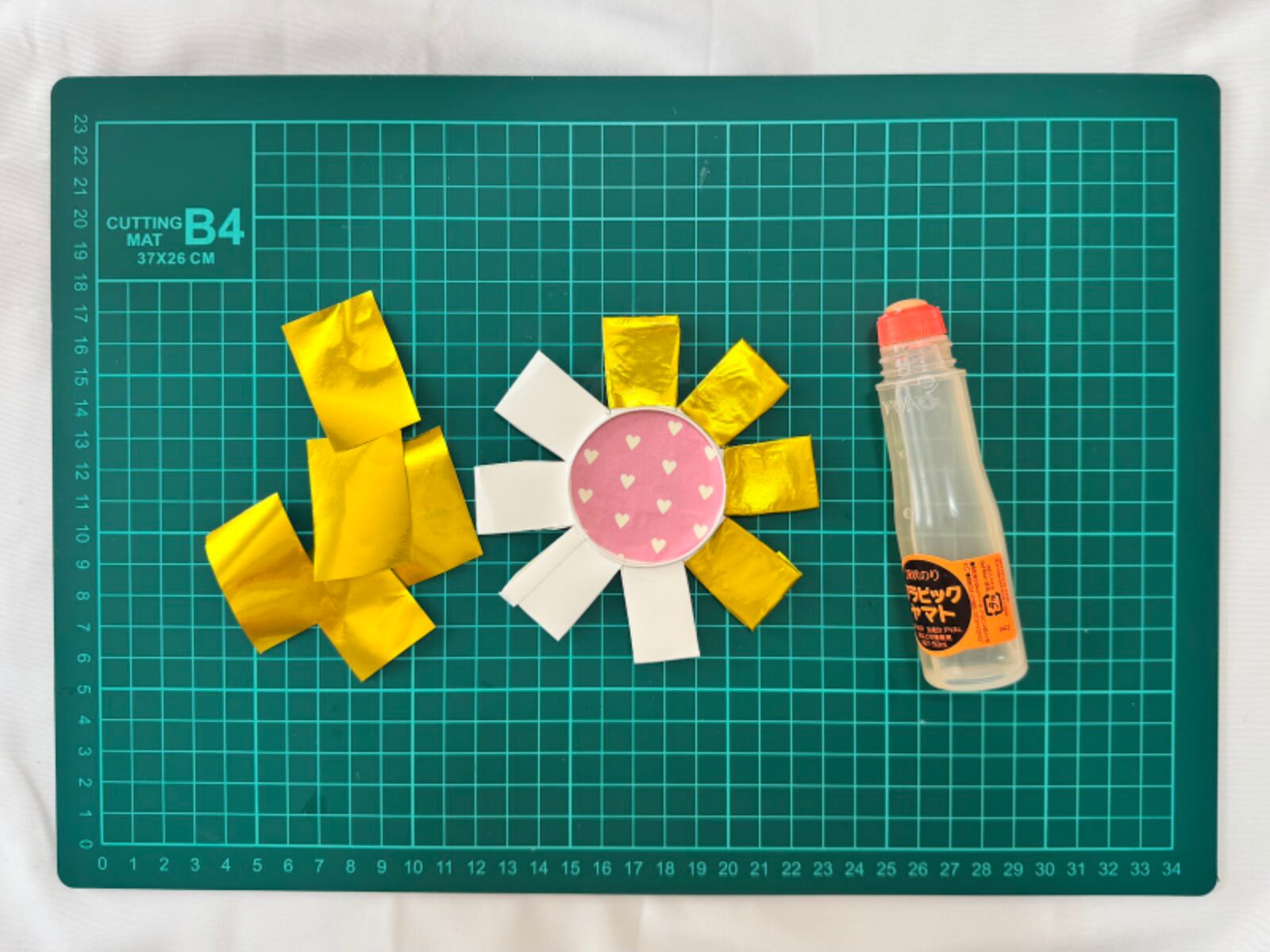 表面を飾り付けていきましょう。折り紙を貼ったり、ペンで絵を描いても可愛いですよ。中央に丸く切った折り紙を貼ると写真のようになります。