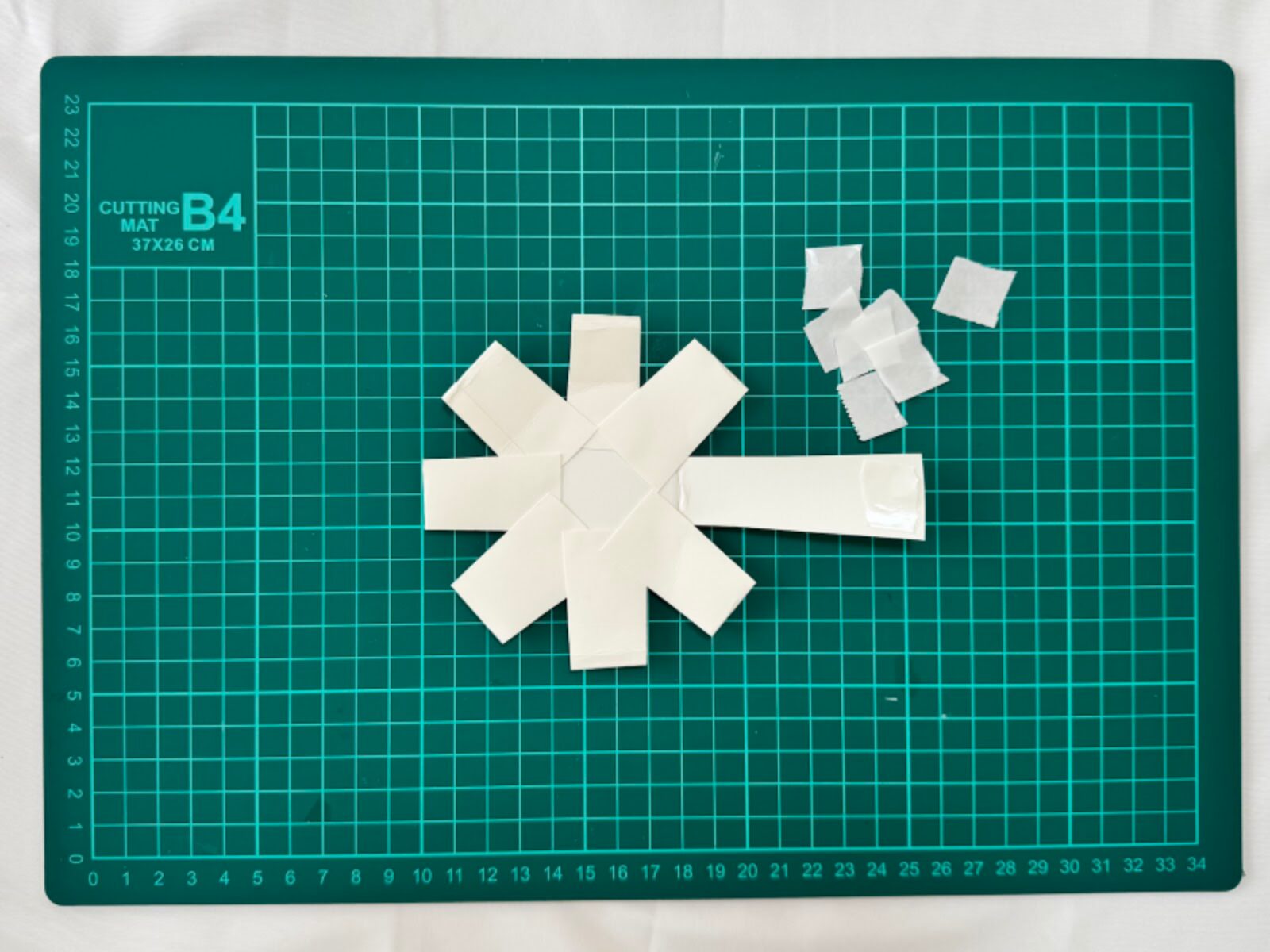 両面テープを貼った面を中央で折り、底面に貼り付けていきます。