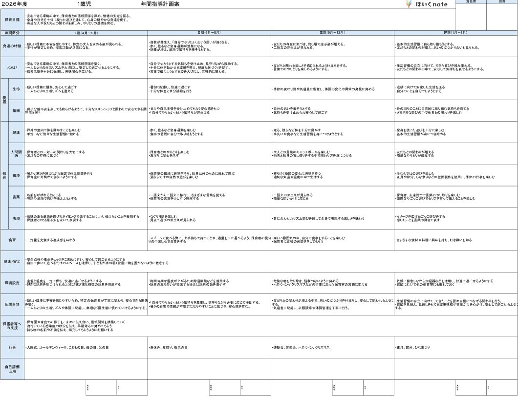 2026年度版、【04月の年間指導計画案(年カリ)】<1歳児クラス>です。