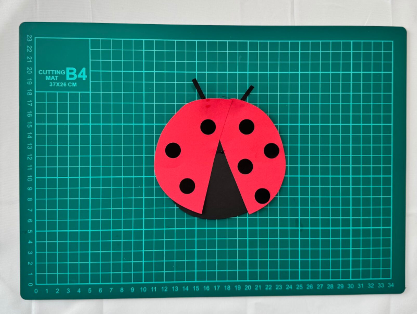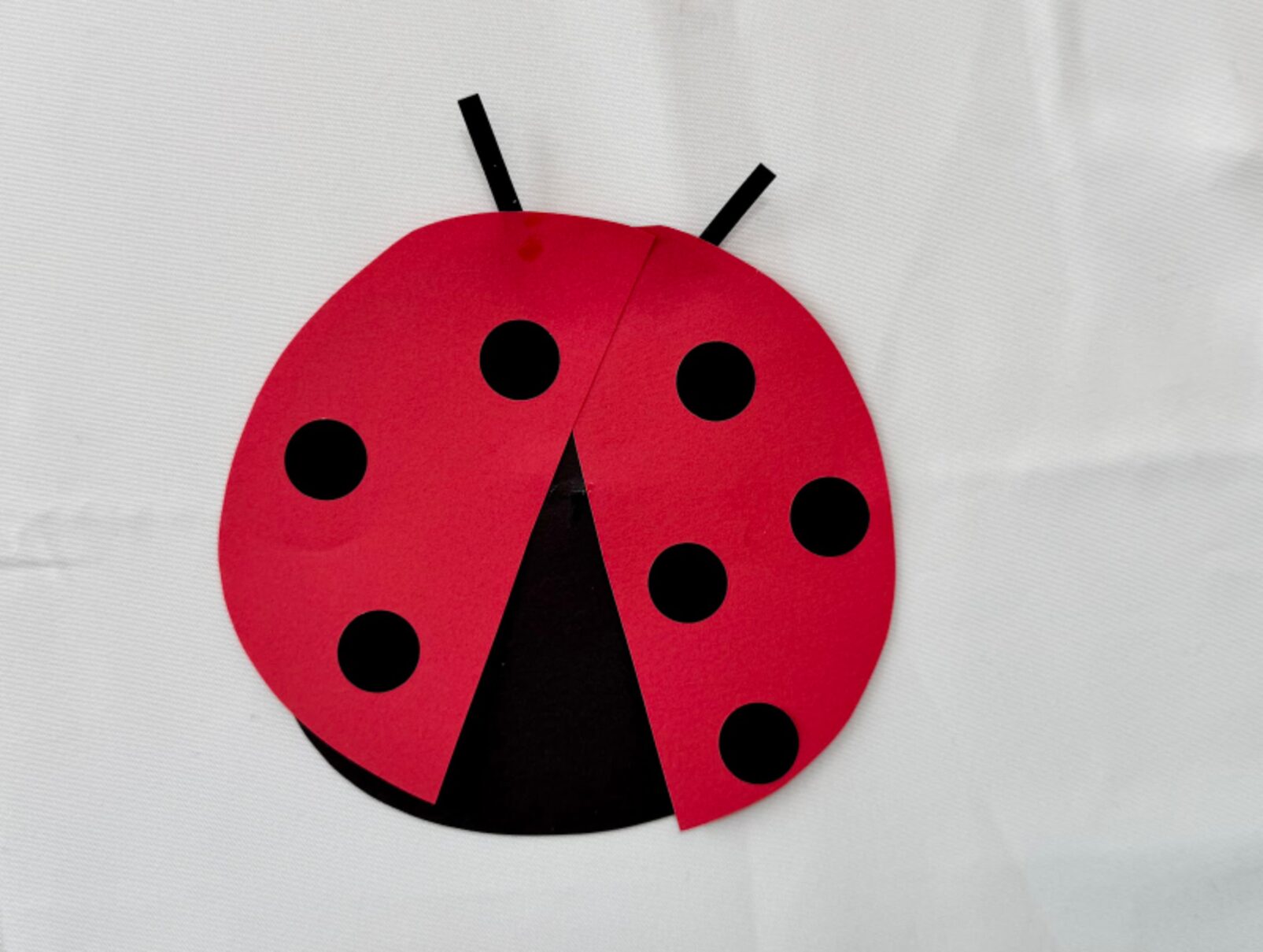 赤い画用紙を少しずらしてのりで貼ります。羽を広げるほど飛んでいるてんとう虫になりますよ。