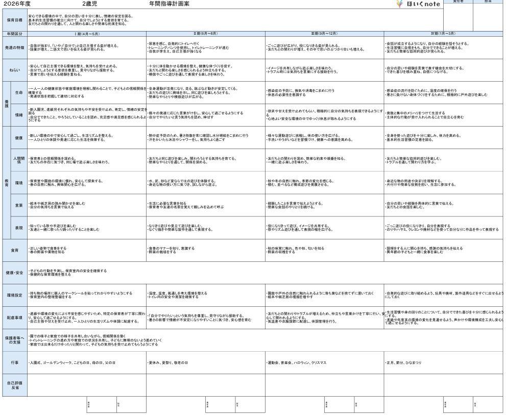 2026年度版、【4月の年間指導計画案(年カリ)】<2歳児クラス>です。