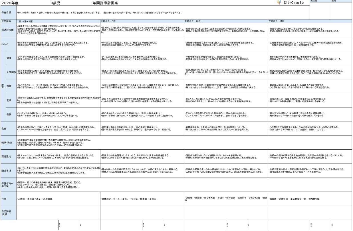 【2026年度4月の年間指導計画案(年カリ)】文例とフォーマット<3歳児クラス>