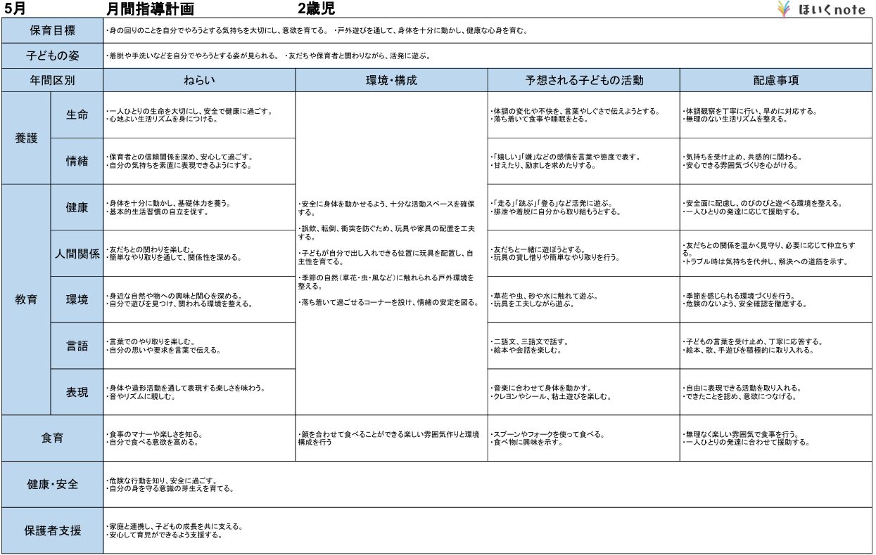 【2026年度5月の指導計画(月案)】文例とフォーマット<2歳児クラス>