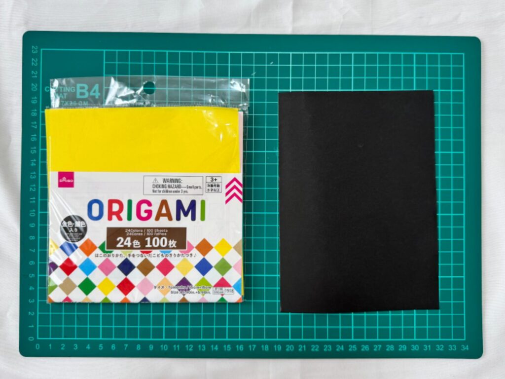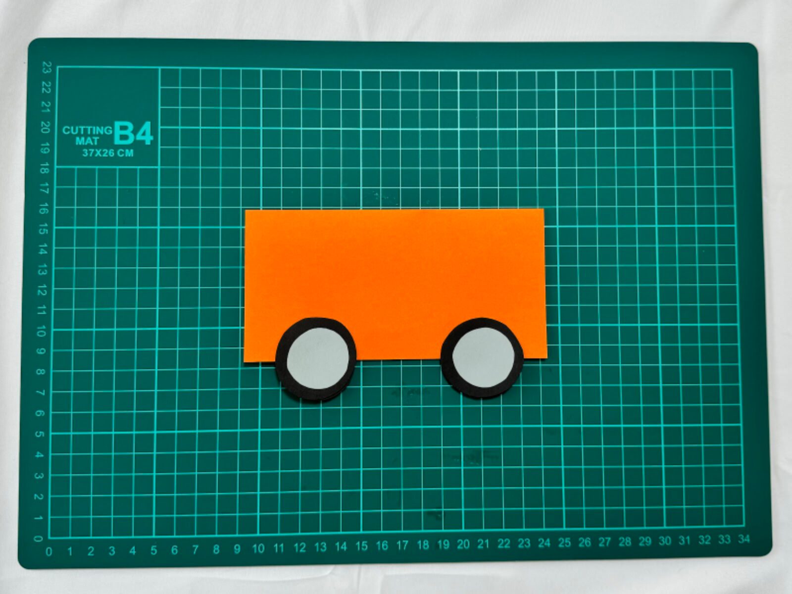 タイヤをのりで貼ります。裏表から折り紙を挟み込むように貼ると両面にお絵描きが出来ます。
