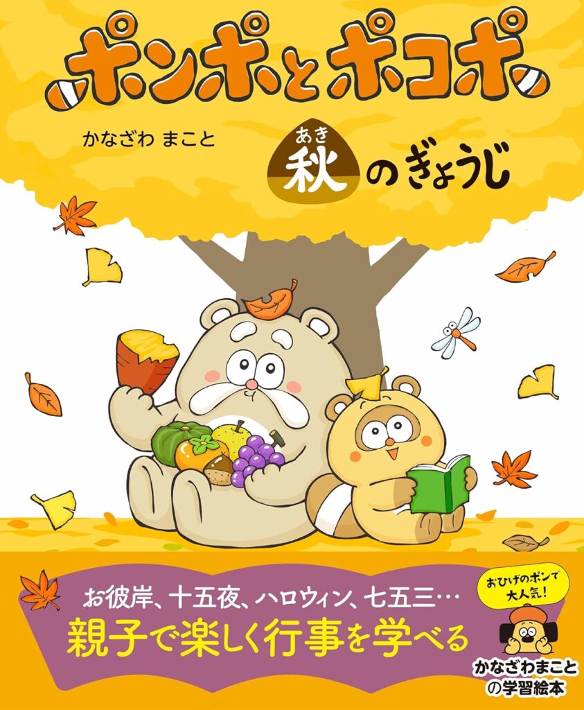 ポンポとポコポのふたりが、秋の行事を通して日本の季節や文化を楽しく紹介してくれる絵本。